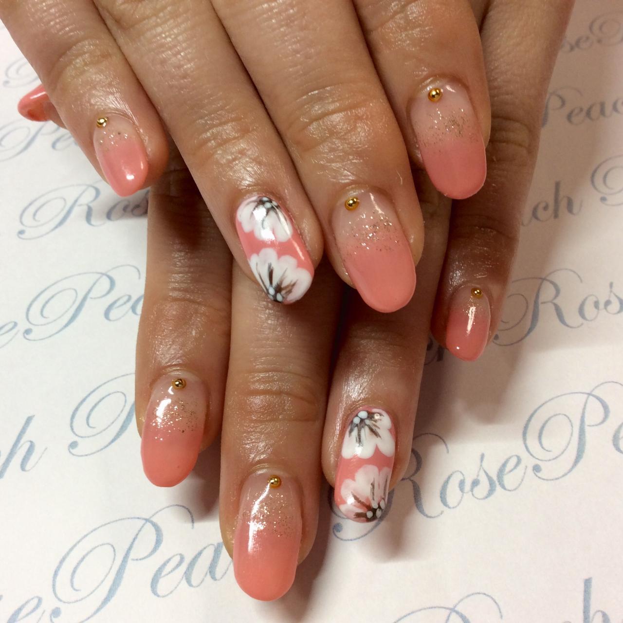 春らしく、オレンジっぽいピンクのグラデーション&お花